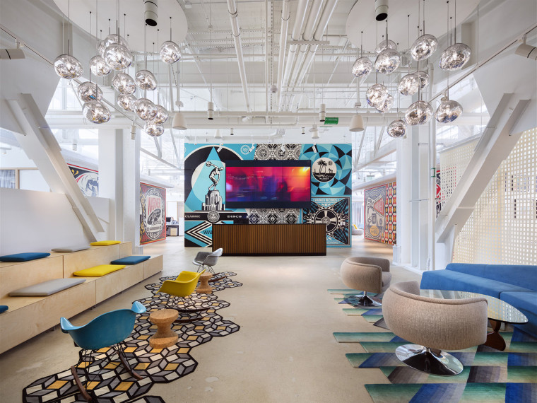 设计师采用黑白灰的主色调以及流行色彩混合的木材作为家具和装饰。培训区是有一个斑斓有趣、带有中世纪风格的空间,绿色的休闲沙发供大家欣赏与培训,米黄的桌椅进行点缀,为员工创造了优雅的工作环境。