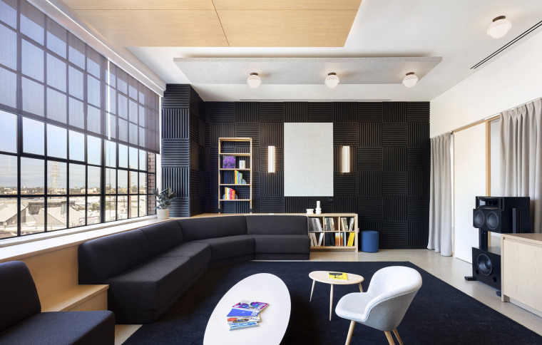休闲区整体给人极简的装修风格,不类似于传统的办公室,采用灵活的办公空间,漂白的橡木制品和带有蓝紫色调的中性面料与建筑原有的浇筑混凝土地面形成了如柔软的对比,使得整个休闲区的装修文艺范十足,黑色的经典色大幅进行铺设,简约中带着高贵,给人艺术气息十足。